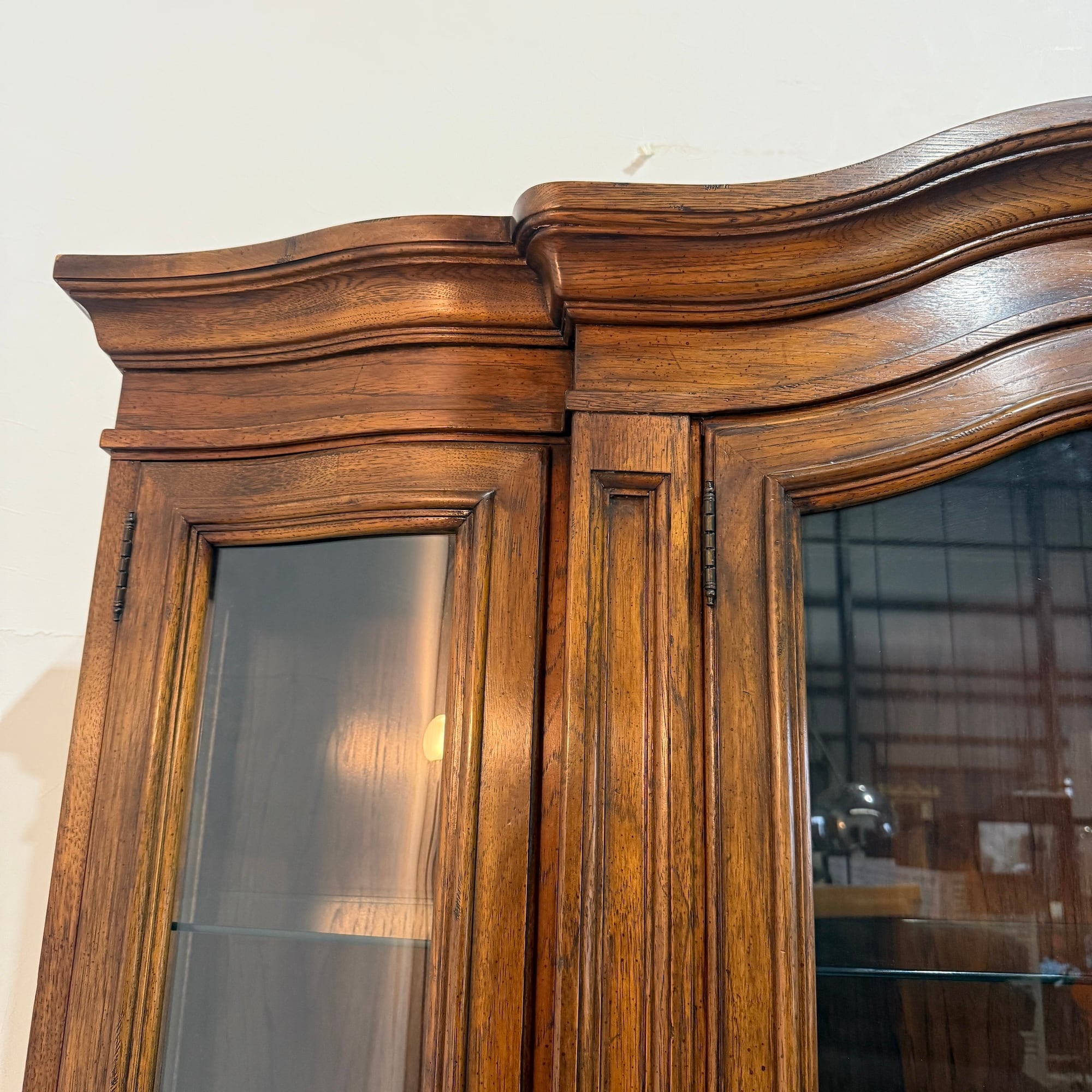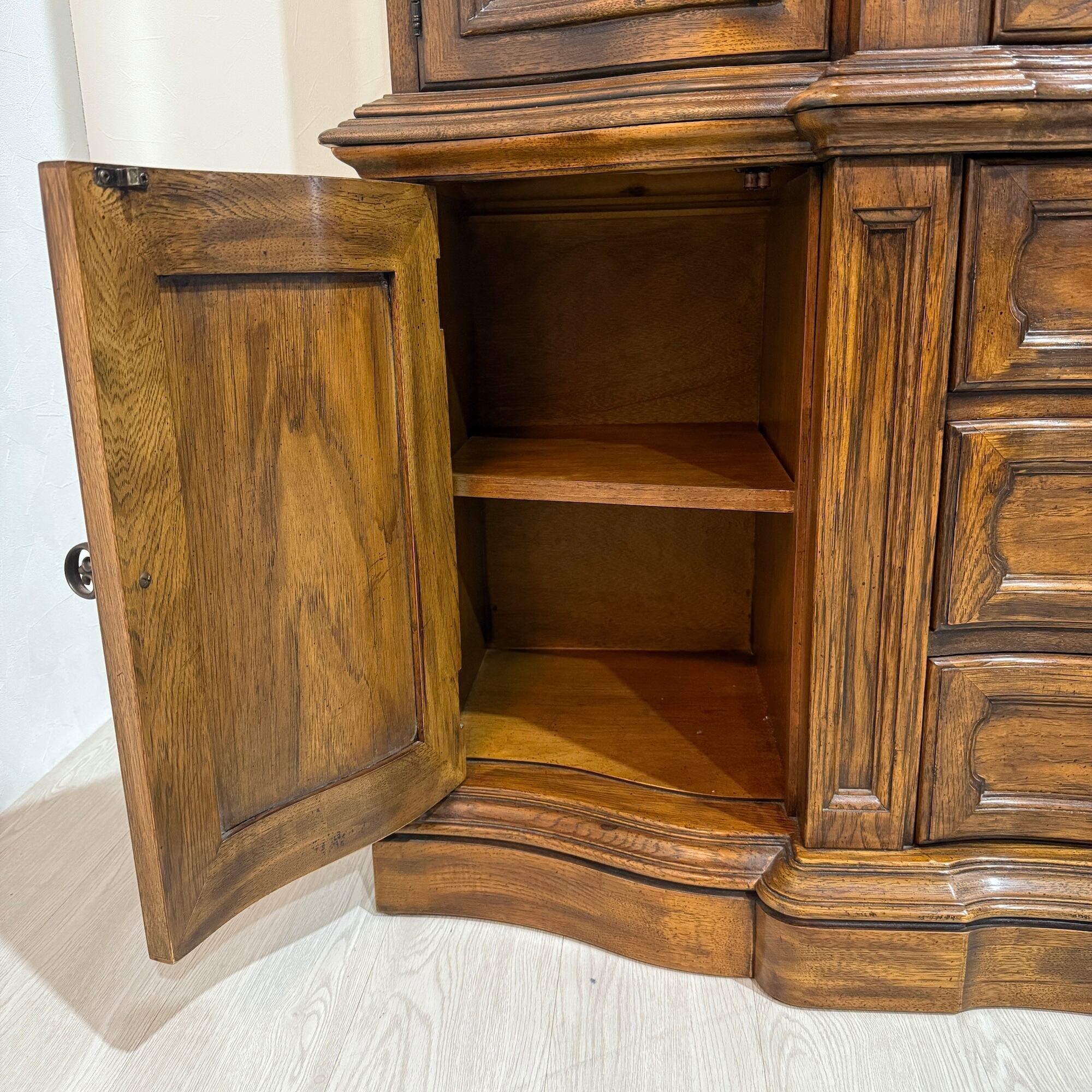 本品は、大丸百貨店にて購入されたドレクセル製の大型キャビネットです。上部のクラウン部分には優雅なカーブが施され、扉や引き出しの曲線も美しく、見る者を魅了する上質な佇まいが魅力です。