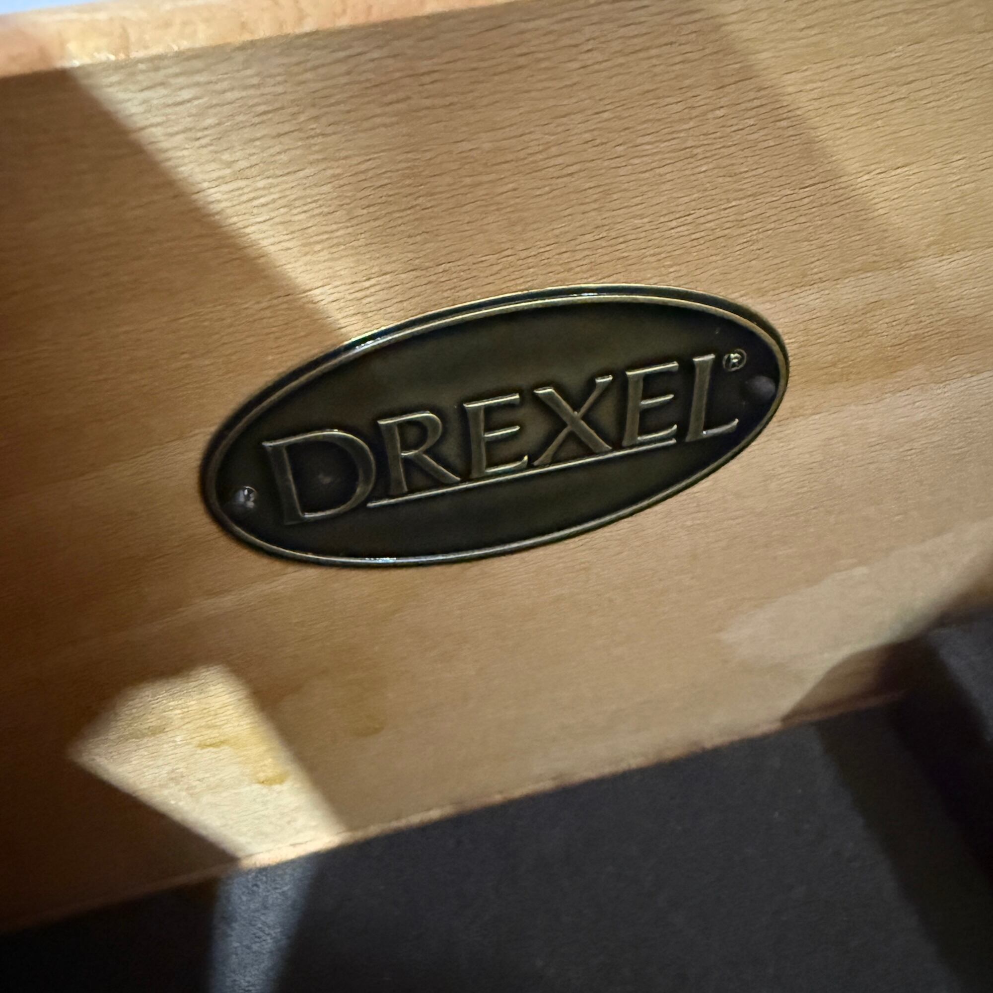 取っ手や鍵穴の金具には繊細な装飾が施されており、細部にまでドレクセルらしい美意識が感じられます。