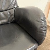 本品は中古としては非常に良好なコンディションを保っています。レザー表面に若干の擦れや小傷は見られますが、全体的にとても清潔感があり、クッションのへたりもほとんどありません。昇降・回転機能もスムーズに動作し、すぐにご使用いただける状態です。