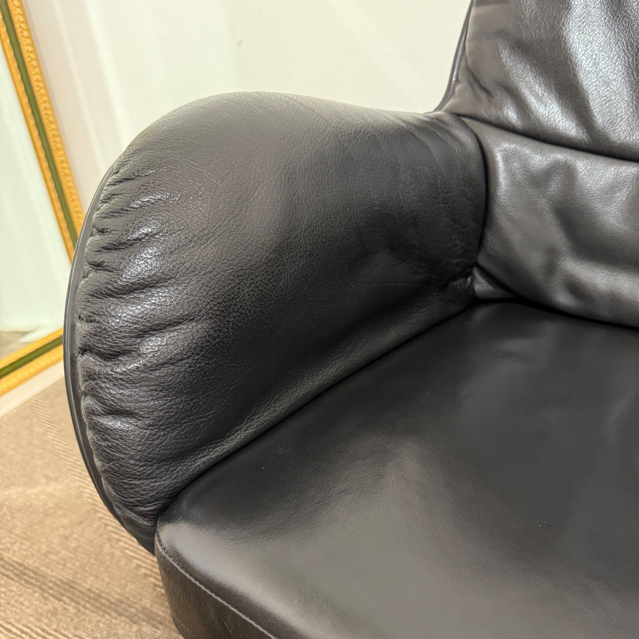 ボリュームのあるクッションと、身体をしっかりと受け止める包み込むようなシルエットが魅力のSERBELLONI。高級感あふれるブラックレザーは、使い込むほどに味わいが増し、経年美化も楽しめます。