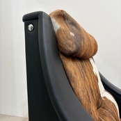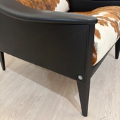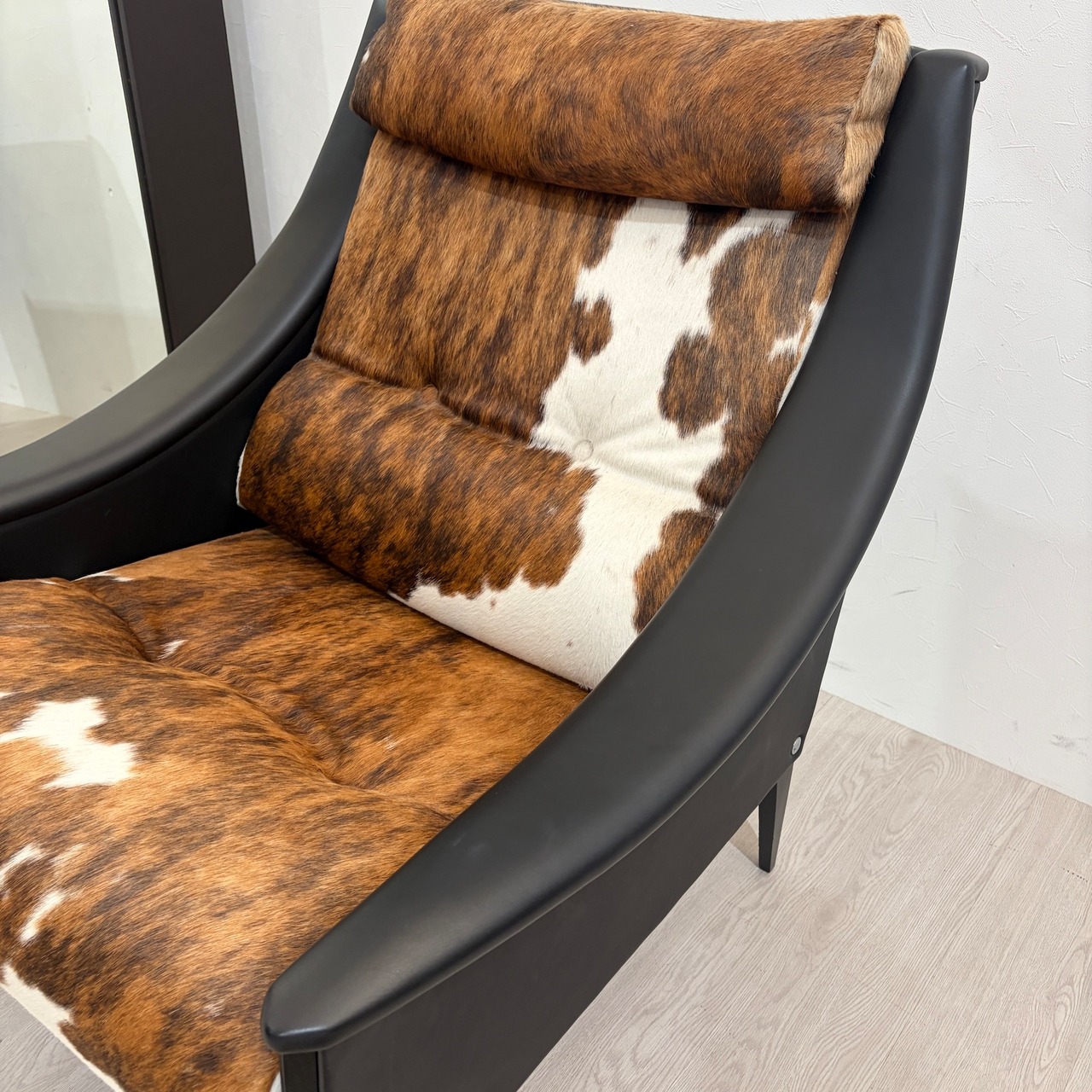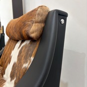 本革 × ハラコの異素材ミックス:シート・背もたれにはリアルカウハイド(毛付き牛革)を使用。1点1点模様が異なるため、世界に一つだけのユニークピースです。