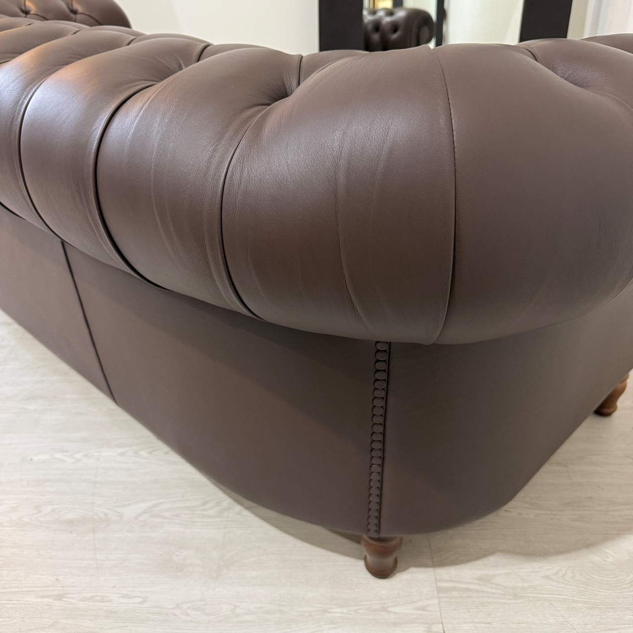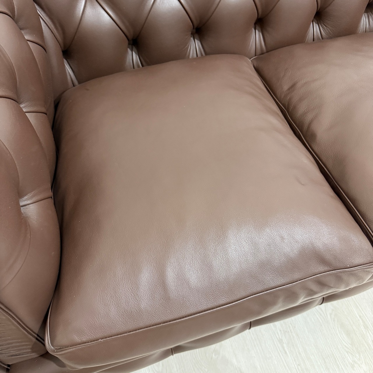 ポルトローナ・フラウのチェスターソファは、イタリア本国でも受注生産が基本であり、日本国内での流通数は極めて限られています。新品定価は400万円以上、納期も数ヶ月〜1年待ちという希少モデルです。