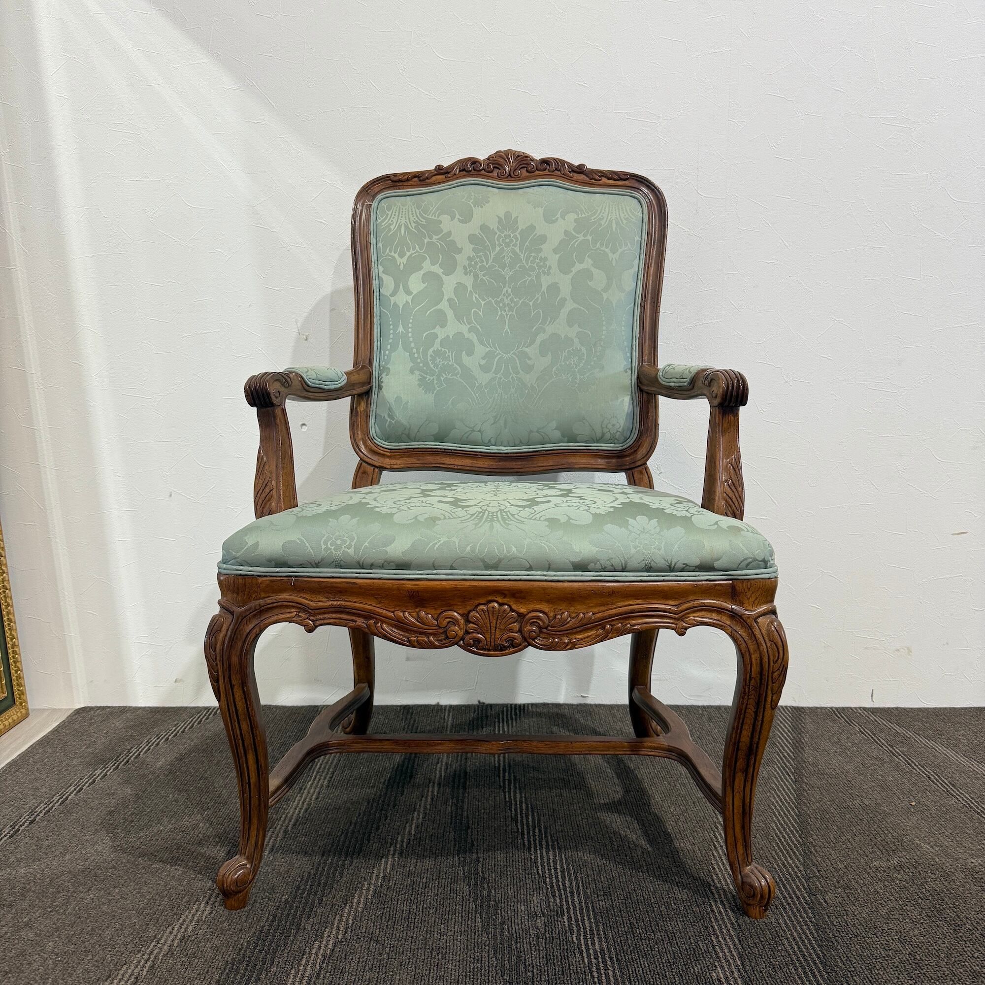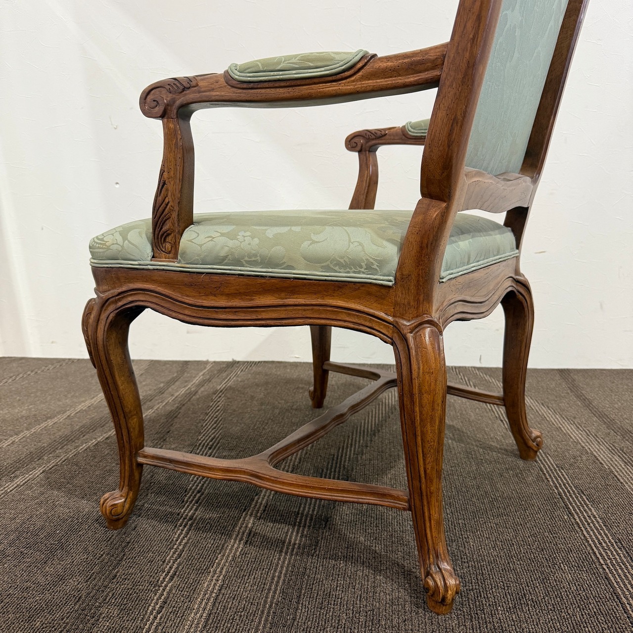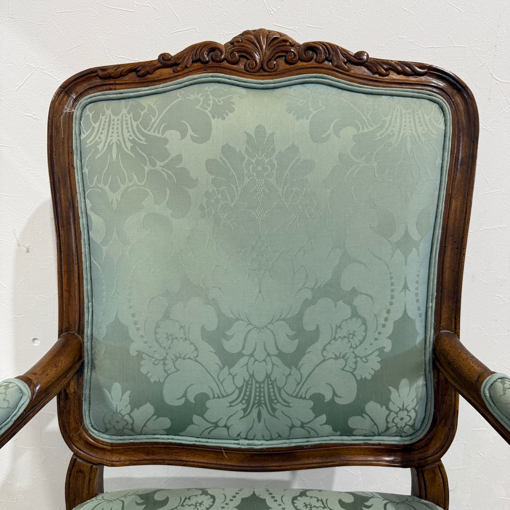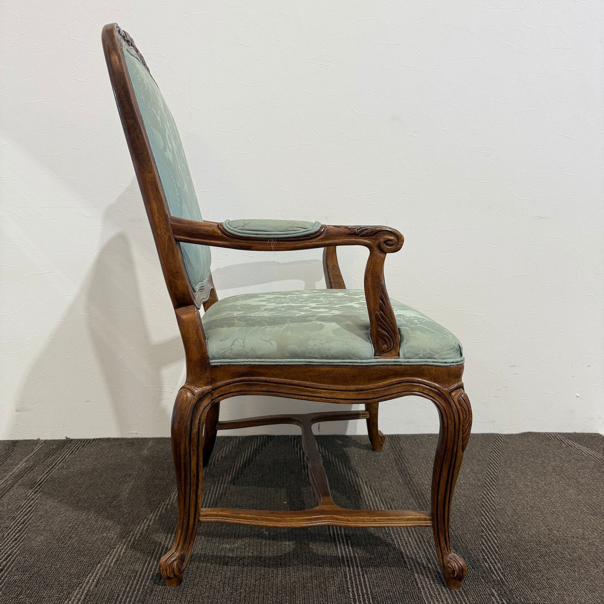本品は、ドレクセルの中でも特に人気の高い「HERITAGE(ヘリテイジ)」シリーズのアームチェア。気品漂うマホガニー材のフレームに繊細な彫刻が施され、背もたれ・座面には淡いグリーンのダマスク柄ファブリックが使用されています。この柔らかな色味と滑らかな光沢が、空間に上品な華やぎをもたらします。