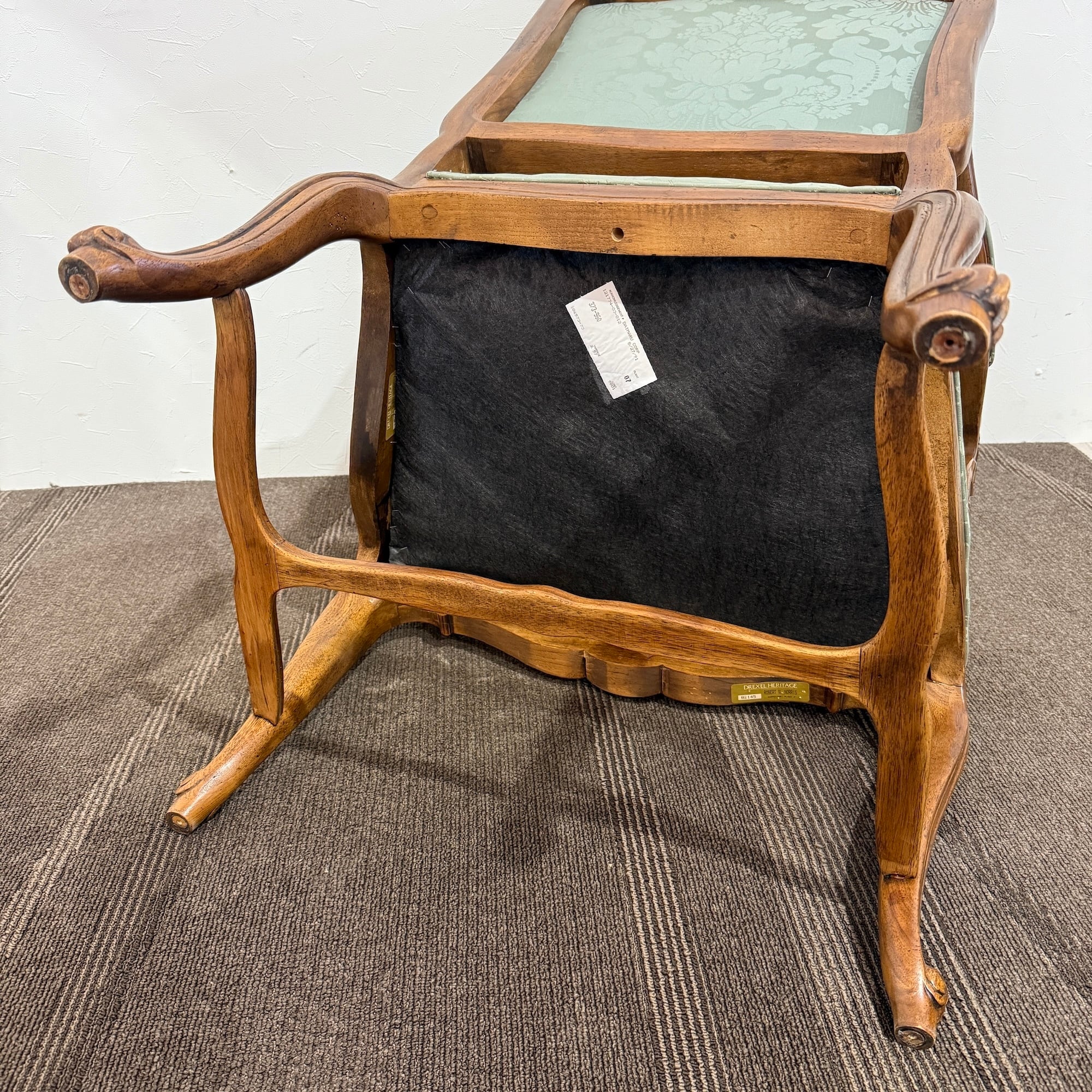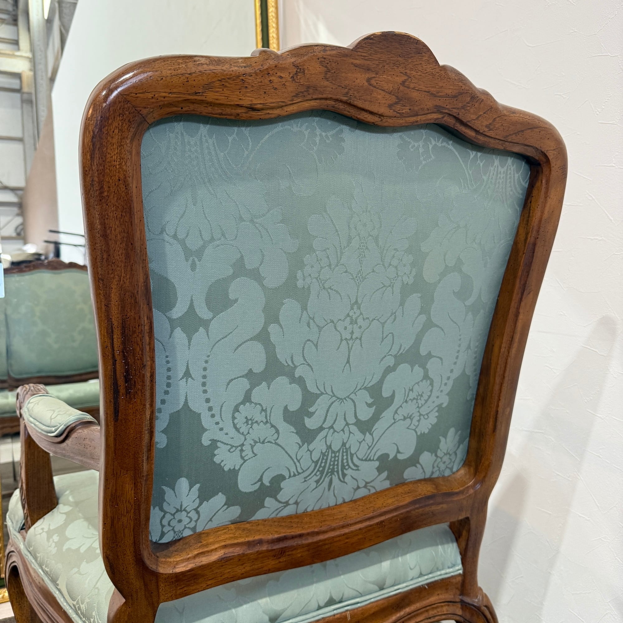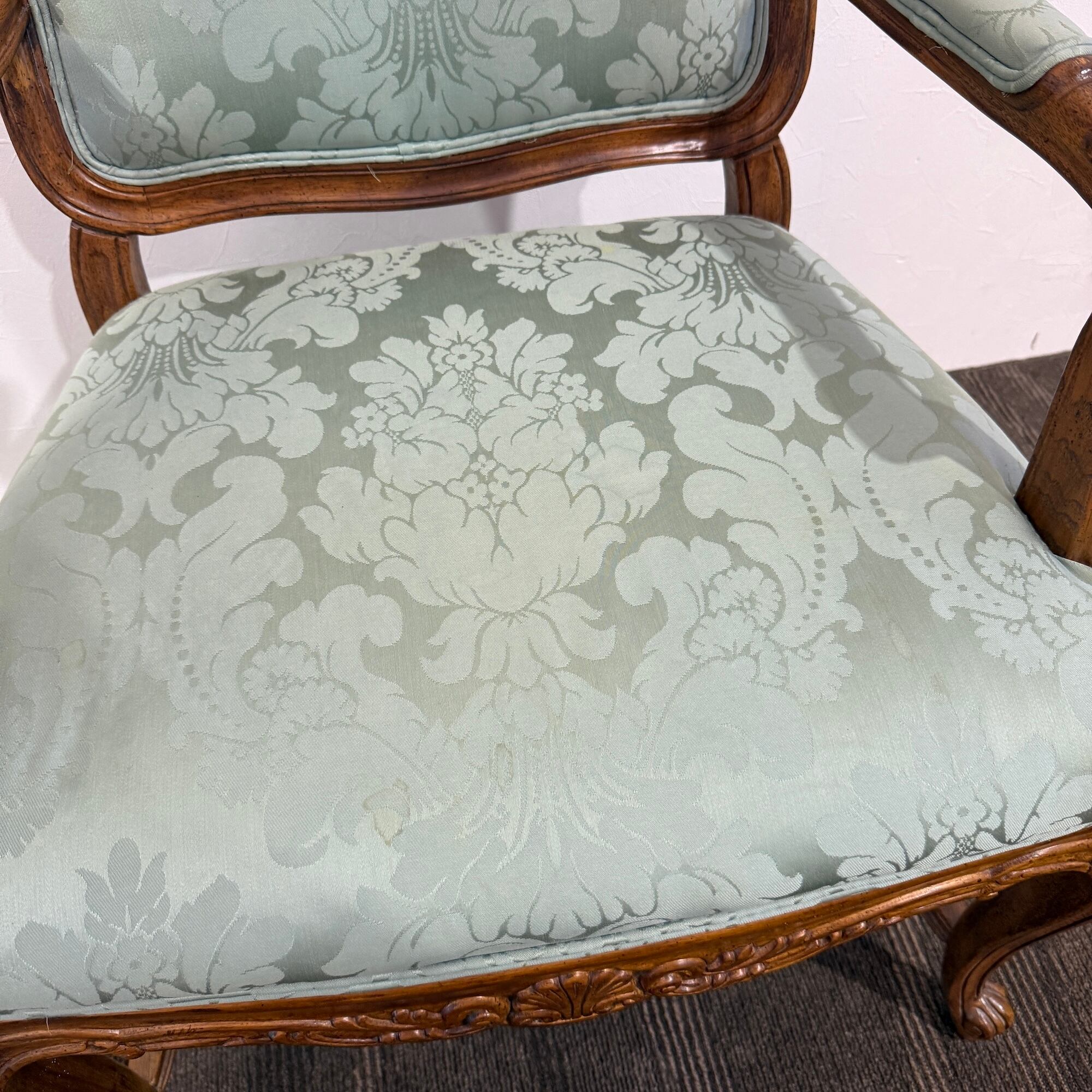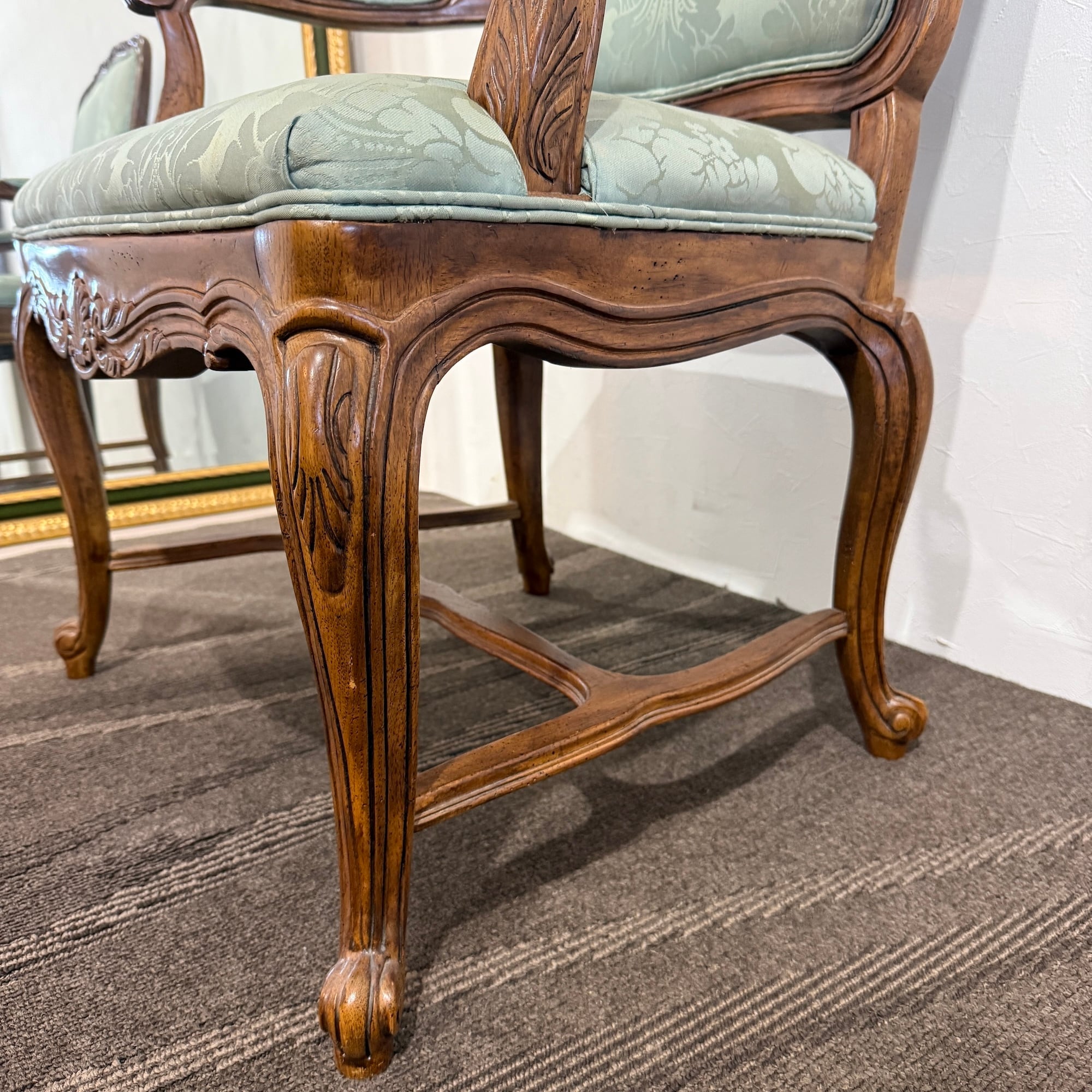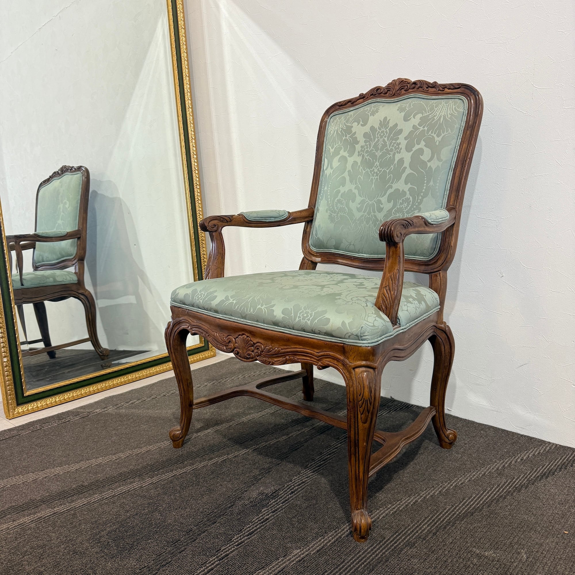 本品は、ドレクセルの中でも特に人気の高い「HERITAGE(ヘリテイジ)」シリーズのアームチェア。気品漂うマホガニー材のフレームに繊細な彫刻が施され、背もたれ・座面には淡いグリーンのダマスク柄ファブリックが使用されています。この柔らかな色味と滑らかな光沢が、空間に上品な華やぎをもたらします。
