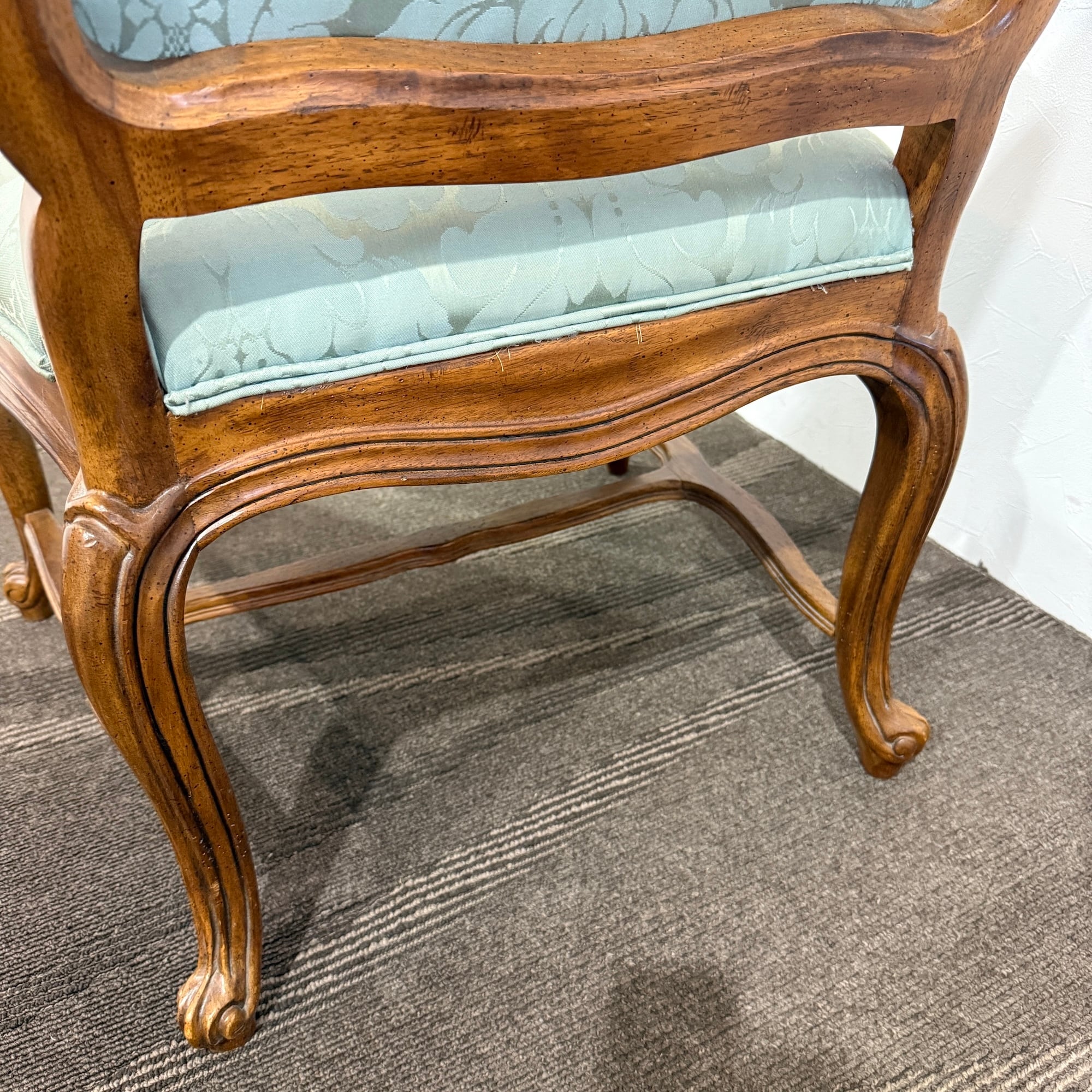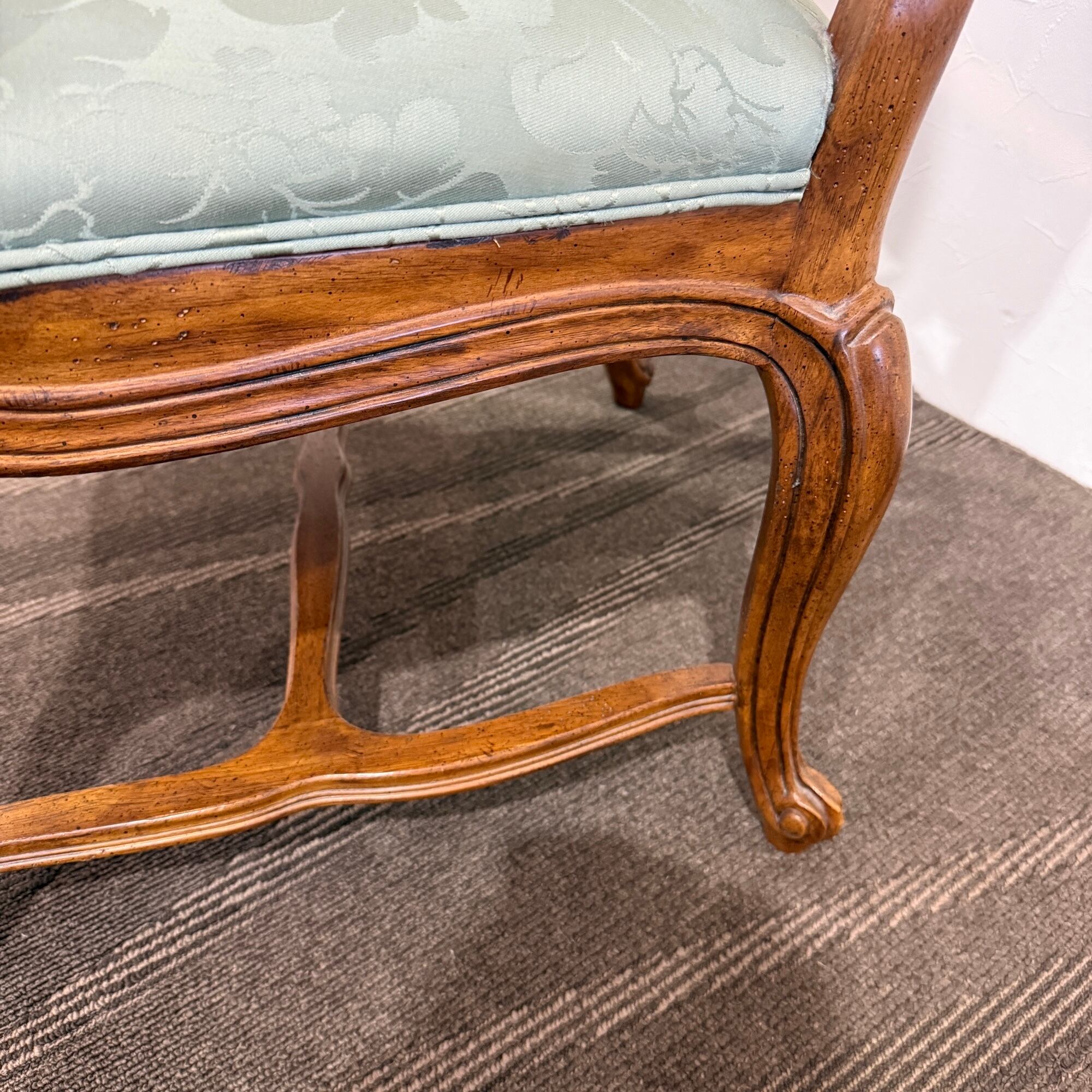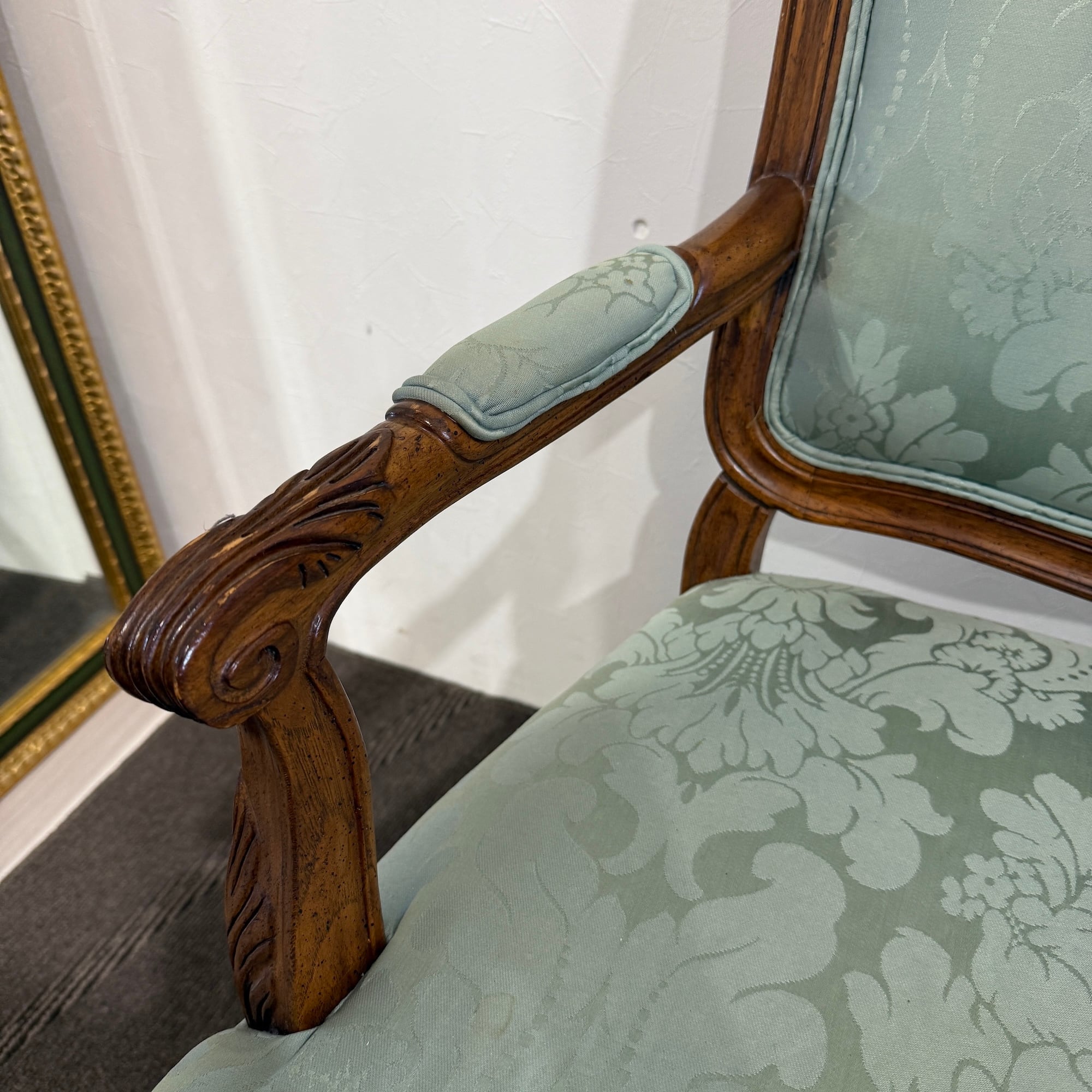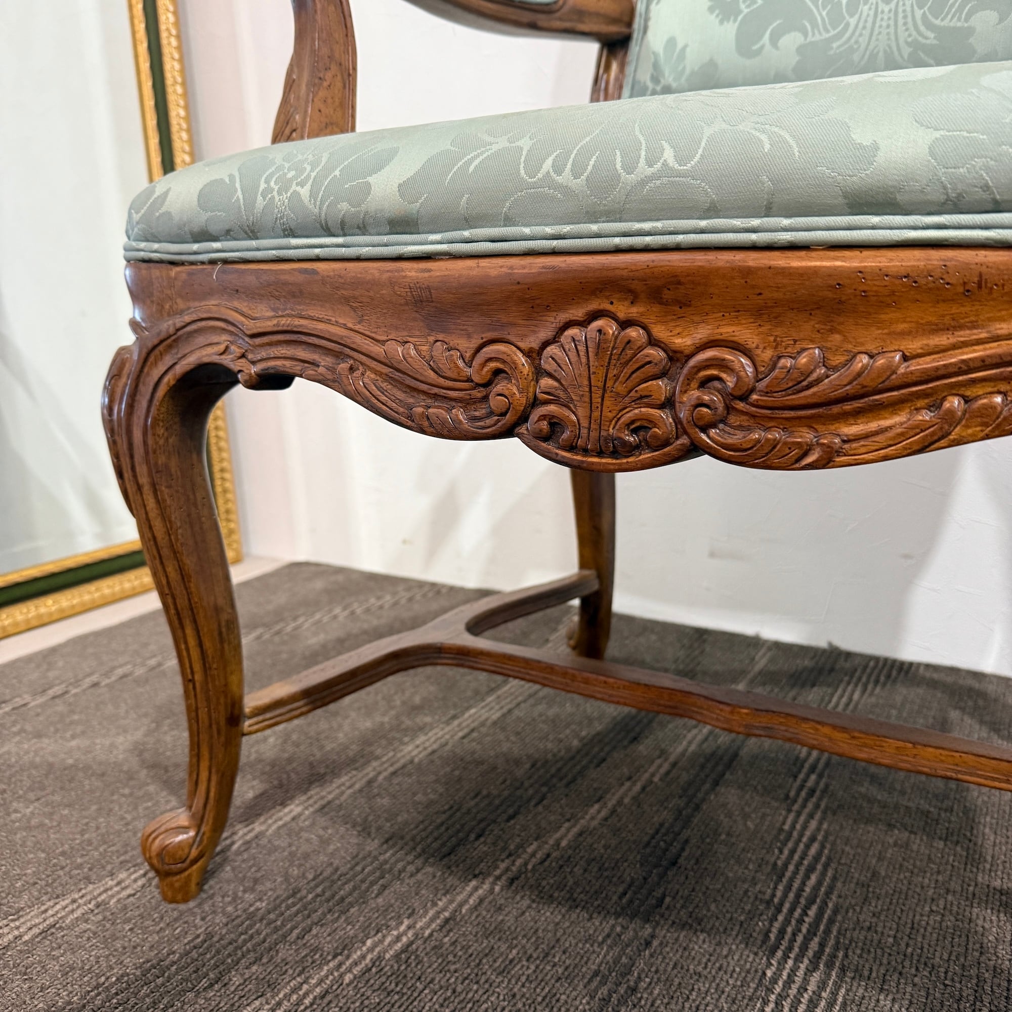 本品は、ドレクセルの中でも特に人気の高い「HERITAGE(ヘリテイジ)」シリーズのアームチェア。気品漂うマホガニー材のフレームに繊細な彫刻が施され、背もたれ・座面には淡いグリーンのダマスク柄ファブリックが使用されています。この柔らかな色味と滑らかな光沢が、空間に上品な華やぎをもたらします。
